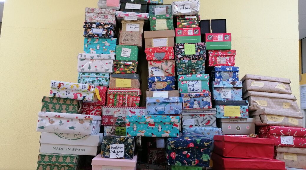 Auch in diesem Jahr wurde die vor einigen Jahren ins Leben gerufene Aktion „Weihnachten im Schuhkarton“ an der Taunusblickschule weitergeführt. Unterstützen werden wir mit diesem Projekt die Hattersheimer-Hofheimer Tafel. Viele Schuhkartons mit Dingen zum Basteln oder Malen, mit Kuscheltieren, etwas zum Naschen oder etwas zum Spielen erreichten die Taunusblickschule. Vielen Dank für all die großartigen Spenden – die Kinder werden sich freuen.